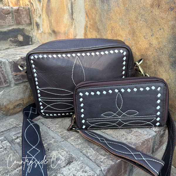 Embark on a fresh journey with our Boot Stitch Purse! This trendy purse showcases a boot stitch design on the front and leather stitching on both sides. The stitched shoulder strap is an extra touch of detail. Plus, the inner zipper pocket ensures your must-haves stay in order while on the move. Let the adventure commence. Also check out the matching boot stitched wallet. ( wallet sold separate)