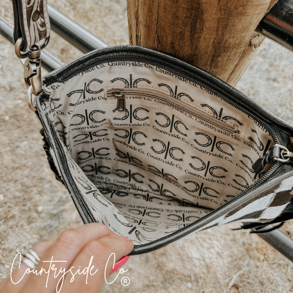 Add some wild west charm to your everyday look with the Rodeo Square Cowhide Checkered Purse. Featuring genuine cowhide hair-on-hide in a bold checkered pattern on the front, this purse pairs leather on the back with a handy pocket. The tooled leather adjustable shoulder strap lets you wear it just right, while playful fringes on the side add a dose of cowboy flair. Finished with a unique Countryside Co lining, it’s a fun and functional companion for all your adventures.