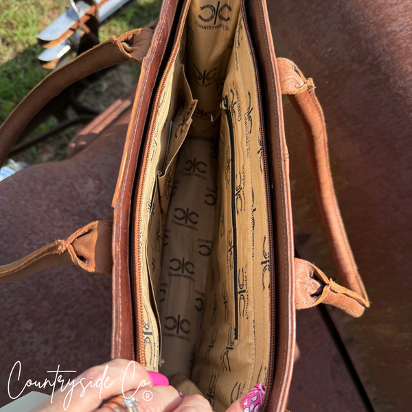 Virginia Cowhide Checkered Concealed Carry Tote Handbag by Countryside Co. is the perfect statement bag.  It is large enough to carry everything you need and still is easy to carry with style.  It has cowhide checkered with tooled leather front with a leather back.  The back has a zipper compartment and the inside has two side pockets and one zipper side pocket. Virginia has zipper closure to keep everything in place and a detachable adjustable shoulder strap. Made with genuine leather.