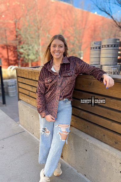 Classic western with a wild twist- the Leopard Lady Button Up is a statement staple. Featuring an allover leopard print on a rich, earthy base, this button up is finished with concho buttons accented with turquoise for that perfect pop of western charm. Designed with chest pockets, contrast stitching, and a relaxed, easy fit, it’s made to wear buttoned up, layered, or thrown on over your favorite tee.