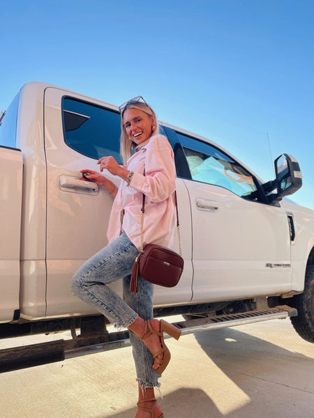 Add a pop of color into your staple wardrobe with this lightweight pink button-up shirt. Featuring a classic collar, button-up details, and a 3/4 sleeve. True to size with a boxy/boyfriend silhouette.