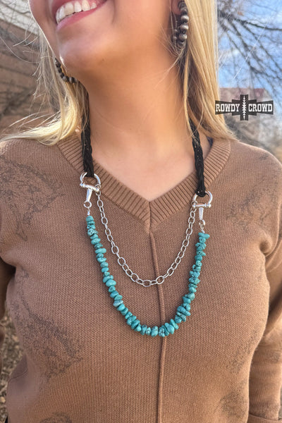 Consider this your official Cowgirl Club badge: The Cowgirls Club Necklace has a braided black cord, bold turquoise chip beads, and silver bit hardware give this necklace its true rodeo-ready edge. Finished with an adjustable chain for the perfect fit, it’s made for cowgirls who ride hard and wear their western style proud.
