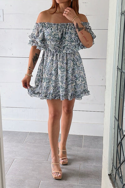 This off-the-shoulder floral dress features soft ruffle detailing and a flattering elastic waist, creating an effortlessly feminine silhouette. Perfect for bridal showers, engagement parties, or any event that calls for a touch of elegance and charm.