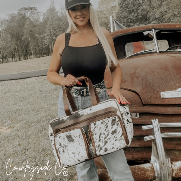 Get ready for your next adventure with the Saddlemen Carry All Cowhide Duffle by Countryside Co.! This versatile bag is perfect for a weekend trip or as a convenient carry on. With its detachable shoulder strap, brass feet on bottom and multiple pockets, including a secure zipper closure, you'll have everything you need within reach. Each is made with unique cowhides so no two alike.