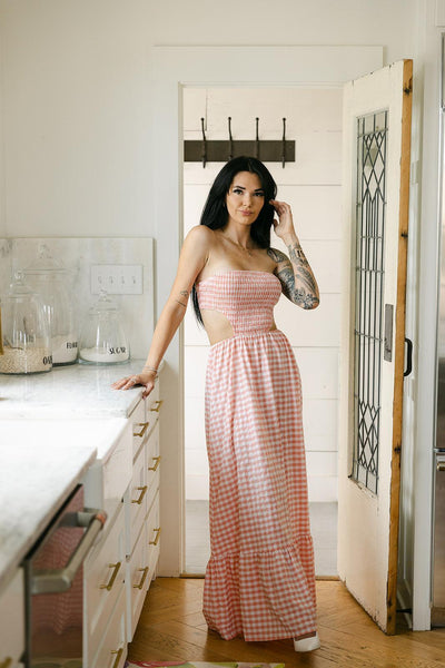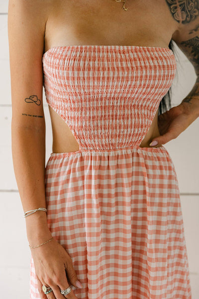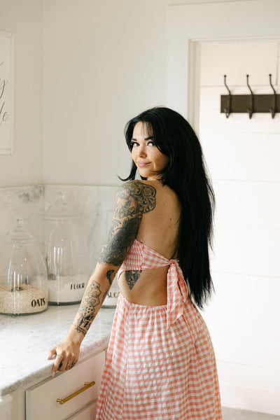 A fresh take on a classic. This gingham dress features a flattering cut-out detail and adjustable tie-back for the perfect fit. Light, playful, and effortlessly put-together—just add sun.