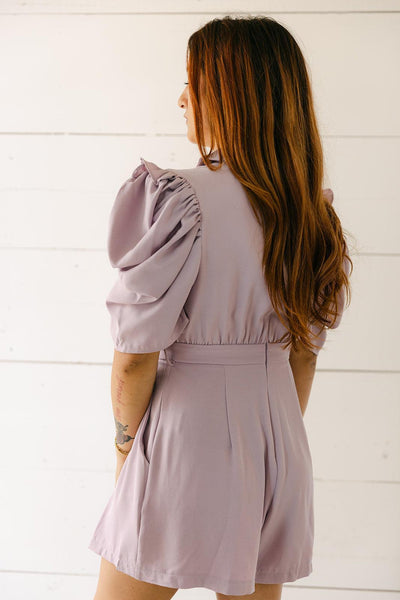 This collared romper features structured puff sleeves, a flattering belted waist, and a sleek back zipper for a polished finish.